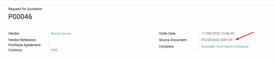 A new RfQ will automatically be created in your Purchases module. Note that you can see for which SO this RfQ has been created thanks to the Source Document field, visible on the RfQ.