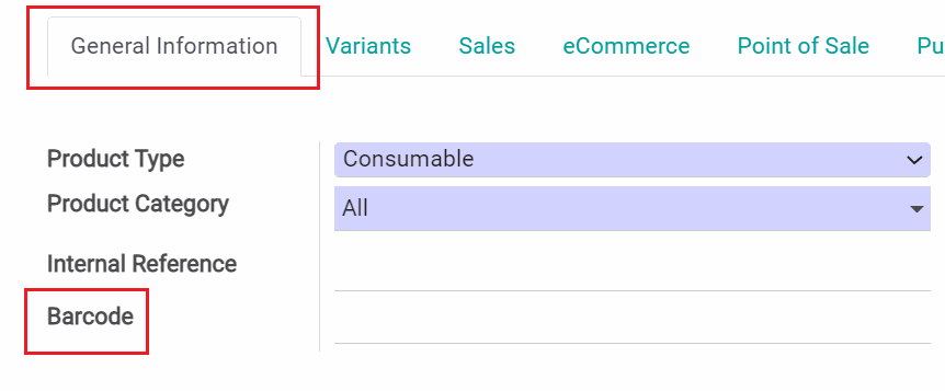 Under the general information tab, you can find a barcode field where you can input any barcode.