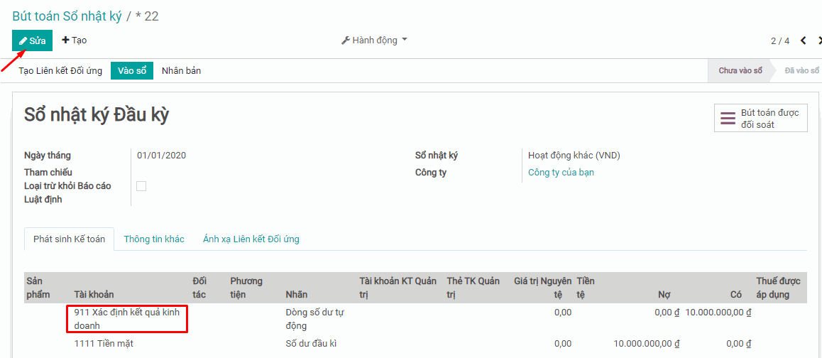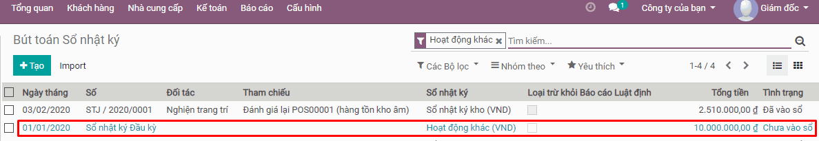 Ngày đầu kỳ: Ngày mà kế toán được quản lý bởi Odoo, nó là ngày của bút toán đầu kỳ được tạo (sẽ được giới thiệu tiếp theo dưới đây);
