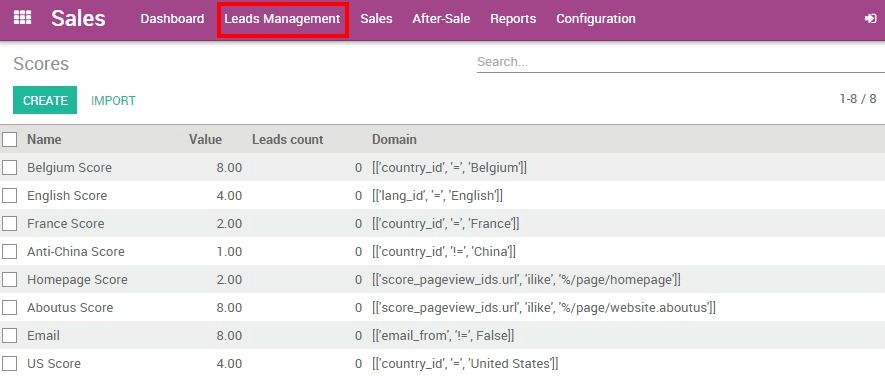Once the module is installed, you should see a new menu Sales --> Leads Management --> Scoring Rules.