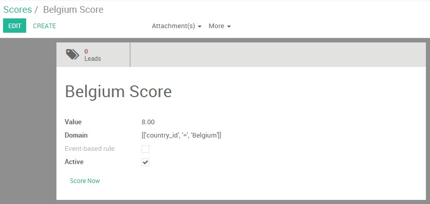 First name your rule, then enter a value and a domain (refer on the official python documentation for more information). For example, if you want to assign 8 points to all the leads coming from Belgium, you'll need to give 8 as a value and [['country\_id',=,'Belgium']] as a domain.