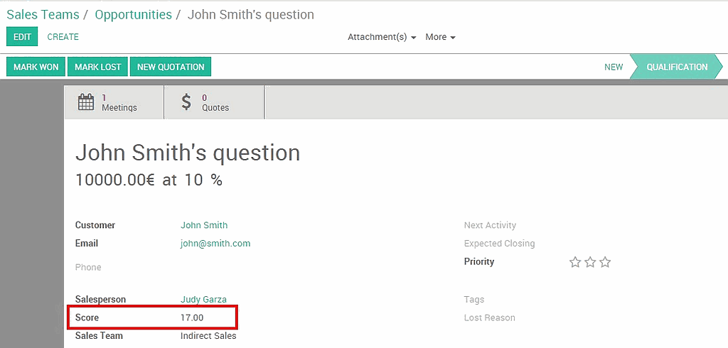 After having activated your rules, Odoo will give a value to all your new incoming leads. This value can be found directly on your lead's form view.