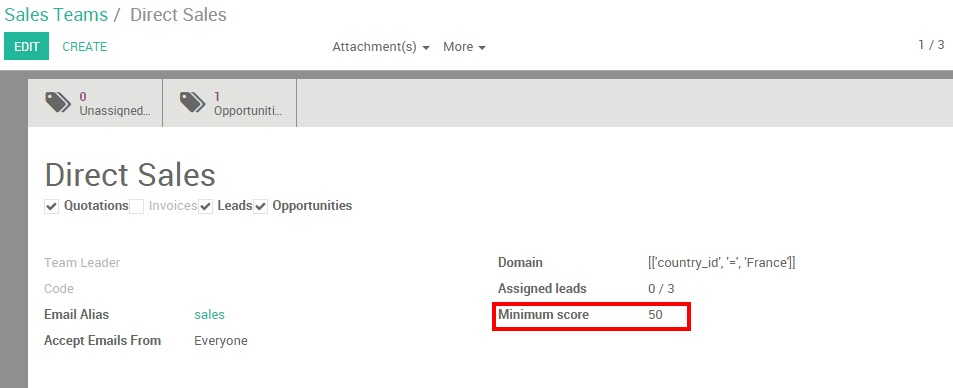 From the example above, the Direct Sales team will only receive opportunities with a minimum score of 50. The prospects with a lower score can either stay in the lead stage or be assigned to another sales team which has set up a different minimum score.