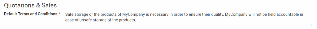 To specify your Terms and Conditions go into : :menuselection:`Sales --> Configuration --> Settings --> Default Terms and Conditions`.