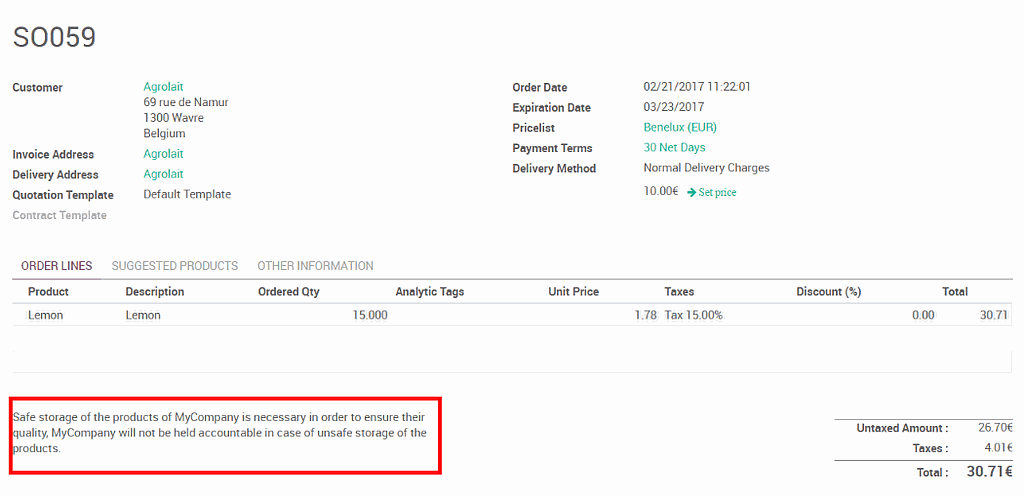 After saving, your terms and conditions will appear on your new quotations, sales orders and invoices (in the system but also on your printed documents).