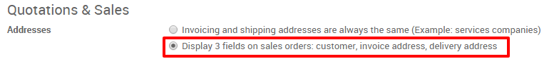First, go to the Sales application, then click on :menuselection:`Configuration --> Settings` and activate the option Enable the multiple address configuration from menu.