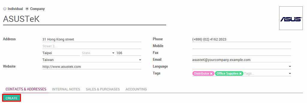 Invoice and/or shipping addresses and even other addresses are added on the contact form. To do so, go to the contact application, select the customer and in the Contacts & Addresses tab click on Create