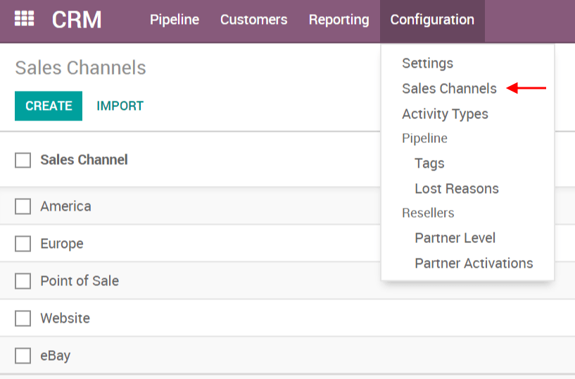 Each sales channel can have its own email alias, to generate leads/opportunities automatically assigned to it. It is useful if you manage several sales teams with specific business processes. You will find the configuration of sales channels under Configuration --> Sales Channels.