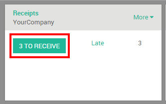 If you purchased physical goods (stockable or consumable products), you can receive the products from the Inventory application. From the Inventory dashboard, you should see a button X To Receive, on the receipt box of the related warehouse.