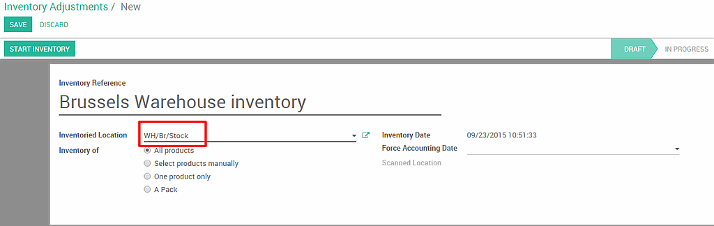 Go into the inventory application, select :menuselection:`Inventory Control --> Inventory Adjustment`. You can then create a new inventory by clicking on Create. Fill in the Inventory Reference, Date and be sure to select the right warehouse and location.