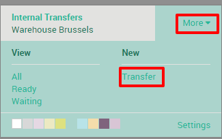 From your dashboard, select a internal movement of one of the two warehouses. To do so, click on :menuselection:`More --> Transfer`.