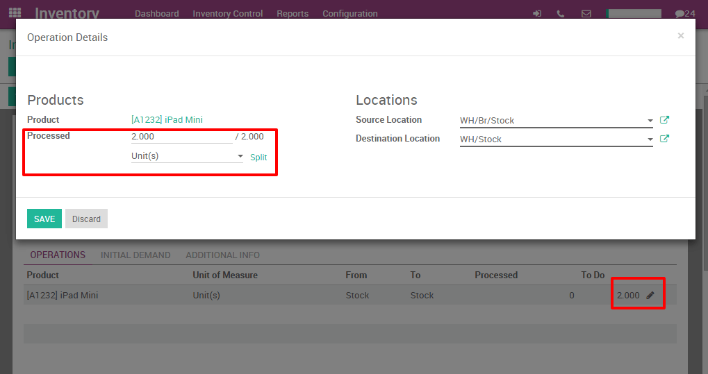 If you select Mark as TODO, Odoo will put the transfer in Waiting Availability status. Click on Reserve to reserve the amount of products in your source warehouse.