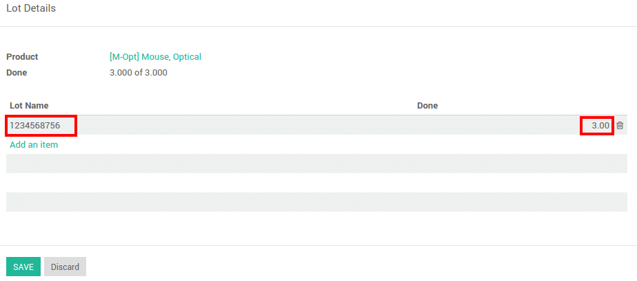 Click on Add an item if the product has not been inventoried yet. You can easily create lots, just type in a new lot number in the column.