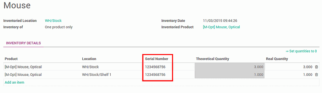 When doing a classic inventory, there is a Serial Number column. If the product has already been assigned with a number, it is already pre-filled.
