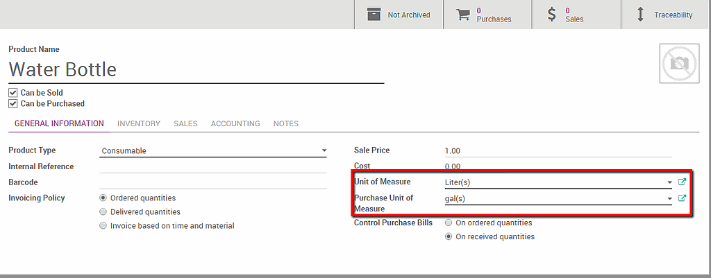 It is possible to create your own category and unit of measure if it is not standard in Odoo (see next chapter).