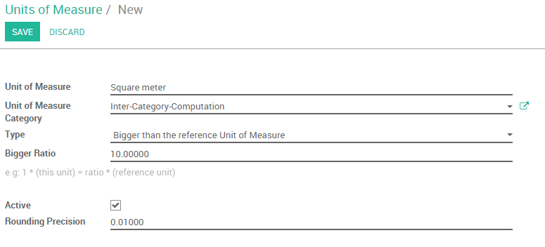 • For the Square Meter, we will specify that 1 Roll = 10 square meters of curtain. It will thus be necessary to specify that as type, the square meter is bigger than the reference unit. The Bigger Ratio is 10 as one Roll = 10 square meters.