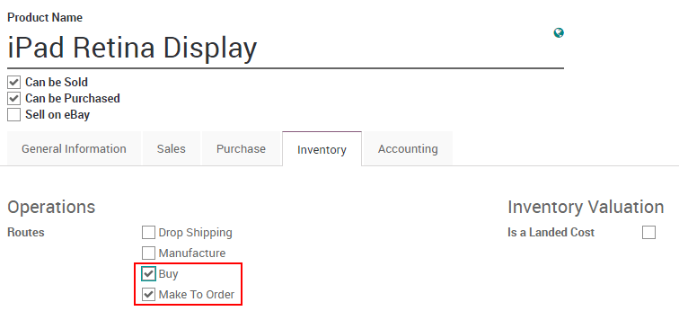 Open a product form and, under the inventory tab, tick the routes Buy and Make To Order.