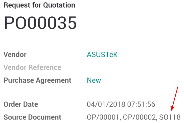 A new RfQ will automatically be created in your Purchases module. Note that you can see for which SO this RfQ has been created thanks to the Source Document field, visible on the RfQ.