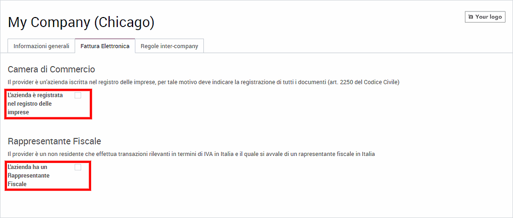 - Regime Fiscale. Il regime fiscale a cui è sottoposta l’Azienda deve essere selezionato scegliendo dalla lista precompilata fornita da Odoo. Chiedi al commercialista qual’è il corretto regime fiscale!